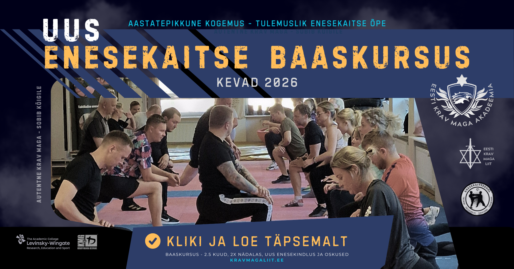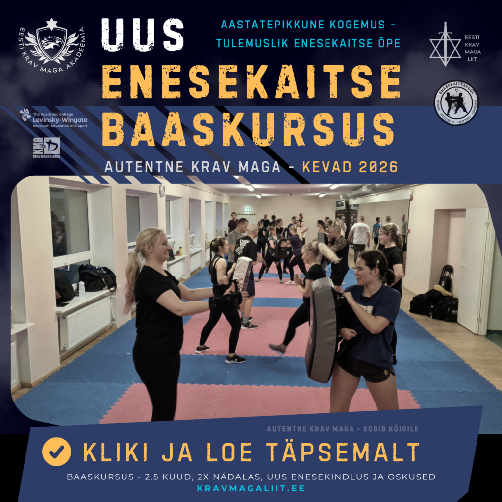 Aprillis 2026 alustab Eesti Krav Maga Akadeemia koostöös Eesti Krav Maga Liiduga uue enesekaitse baaskursusega, mis kestab ca 2.5 kuud ja annab sulle suurepärase võimaluse tõhusaks füüsiliseks treeninguks ning uute oskuste ja teadmiste omandamiseks.